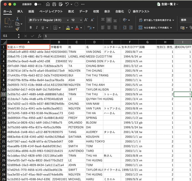 💡 生徒ユーザーID欄にID番号がふられています。再度インポートする際、この番号によって登録済みの学生情報を識別し更新されます。この番号はこのままにし、変更しないでください。