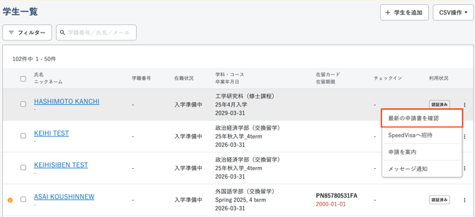 「最新の申請書を確認」から、この学生の申請書情報の入力状況を確認できます。
