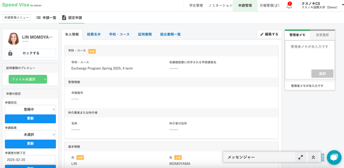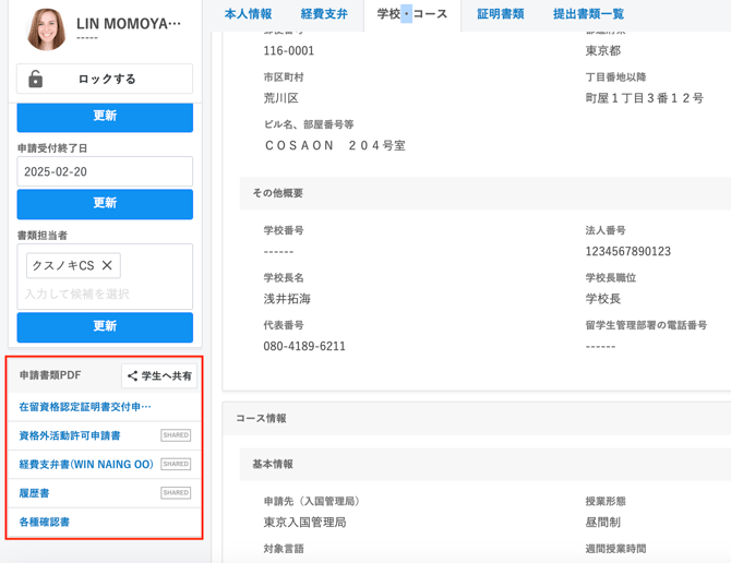 学校・コースタブ:この学生に紐づけられている学校情報及び学部コース情報が表示されます。個別に編集することも可能です。